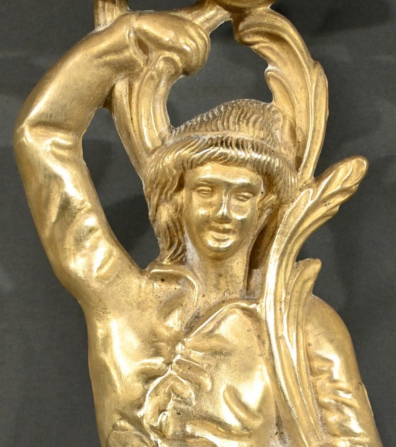 La pièce centrale est une figure masculine élégamment enlacée de rinceaux, portant au-dessus de sa tête une boucle serpentine ouverte.