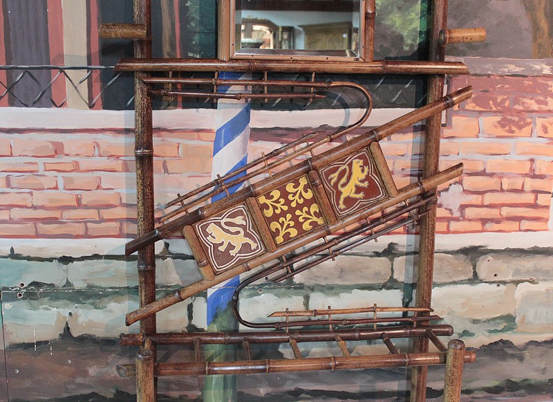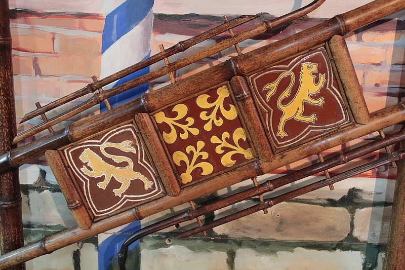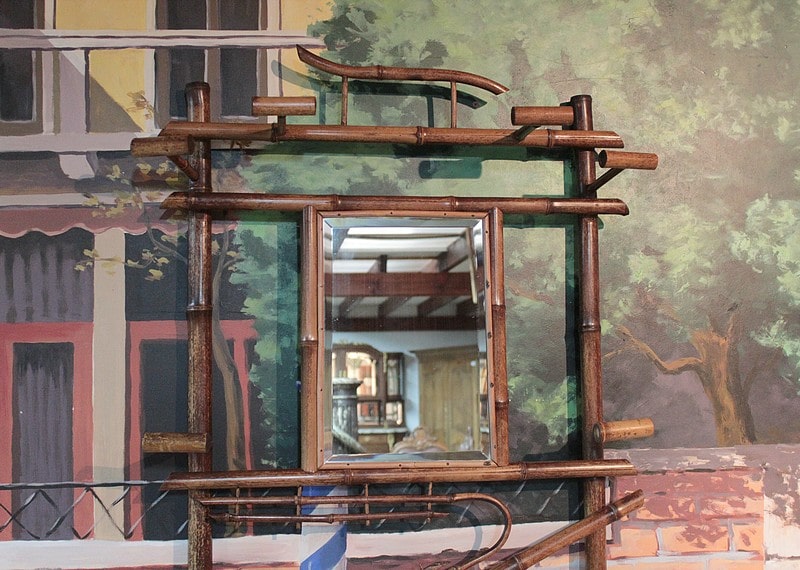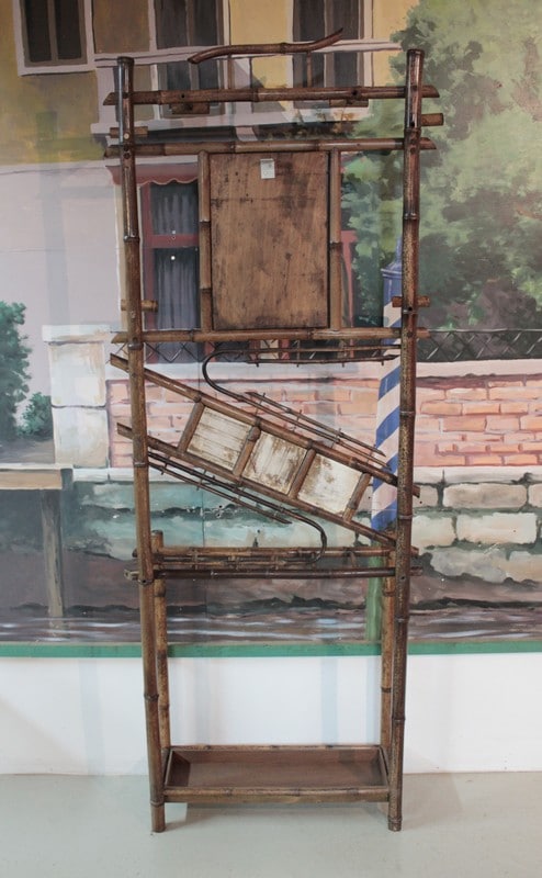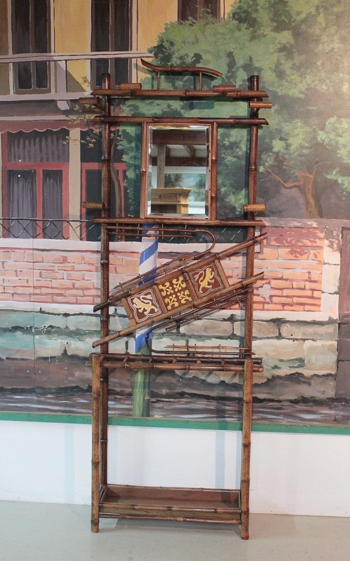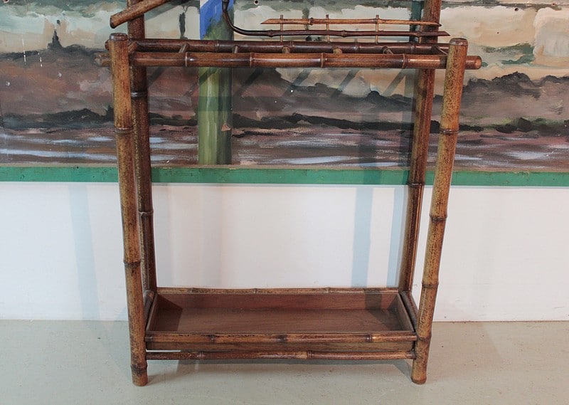 Vestiaire en bambou à 6 patères et un porte-parapluies avec bac en bois. Miroir biseauté en partie haute et décor de céramiques au milieu.