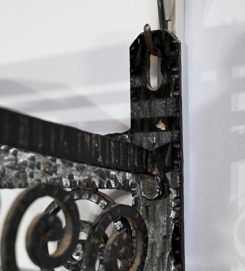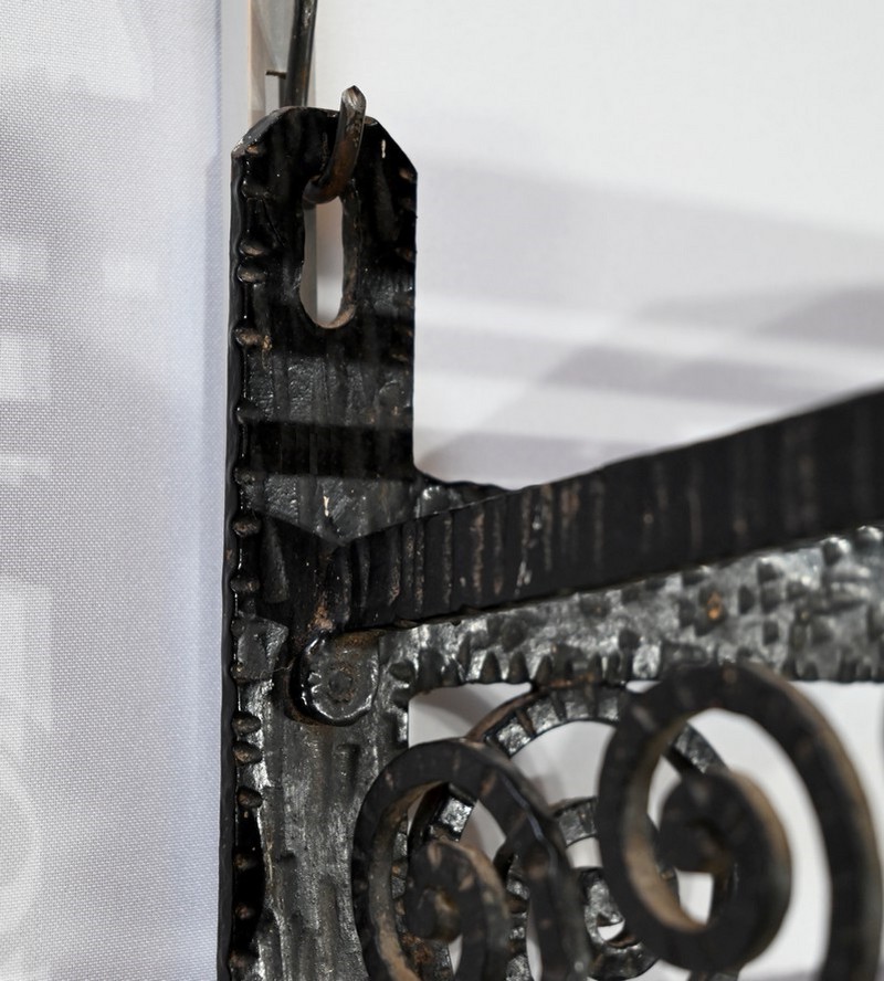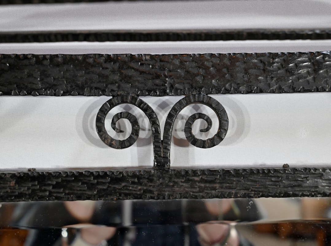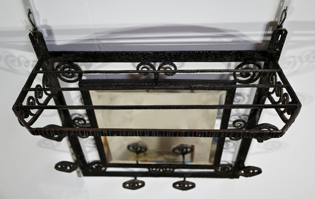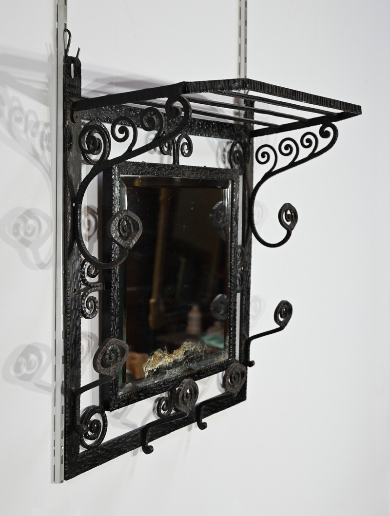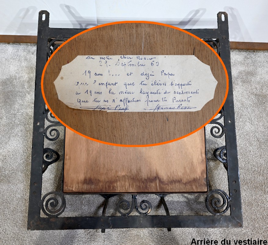 Ce vestiaire présente un cadre en fer forgé ouvragé et agrémenté de diverses volutes.