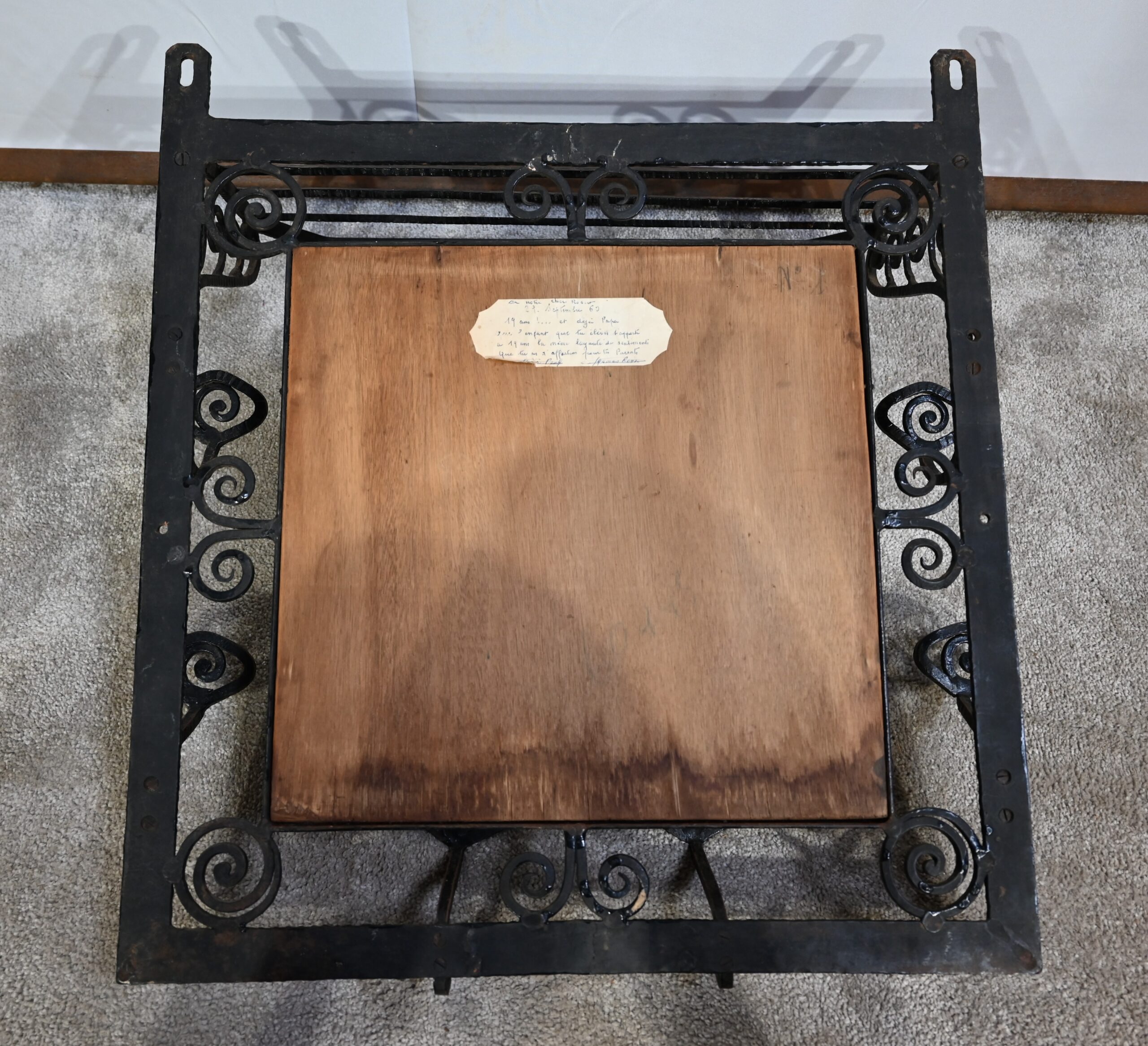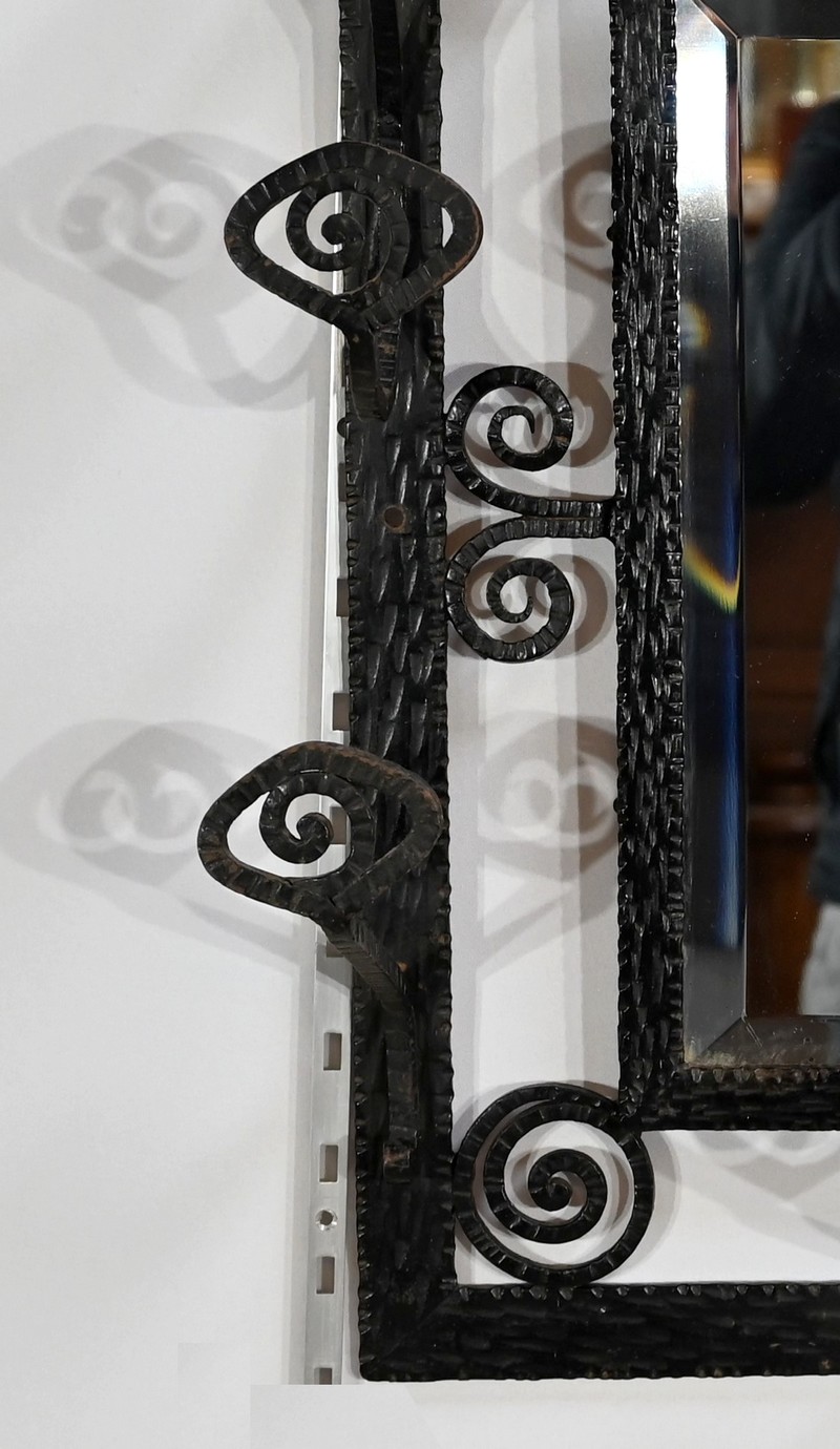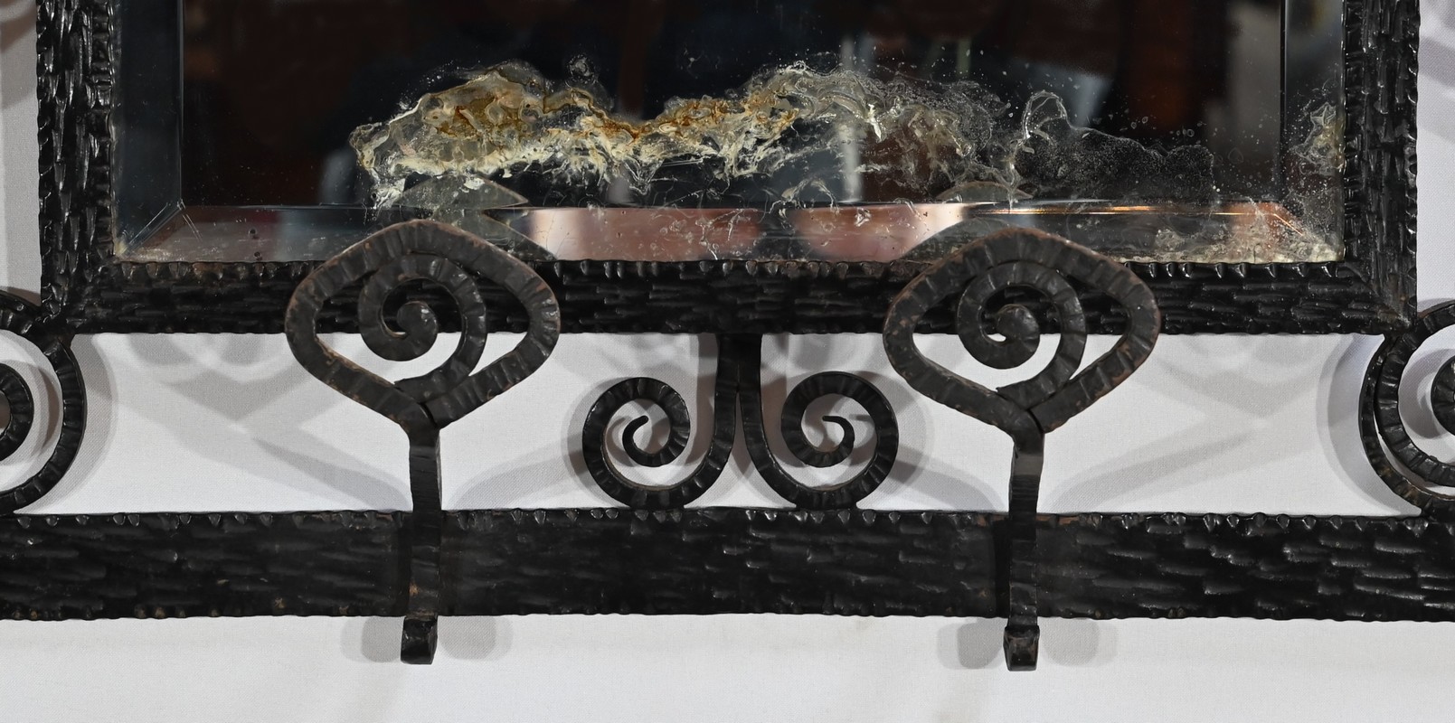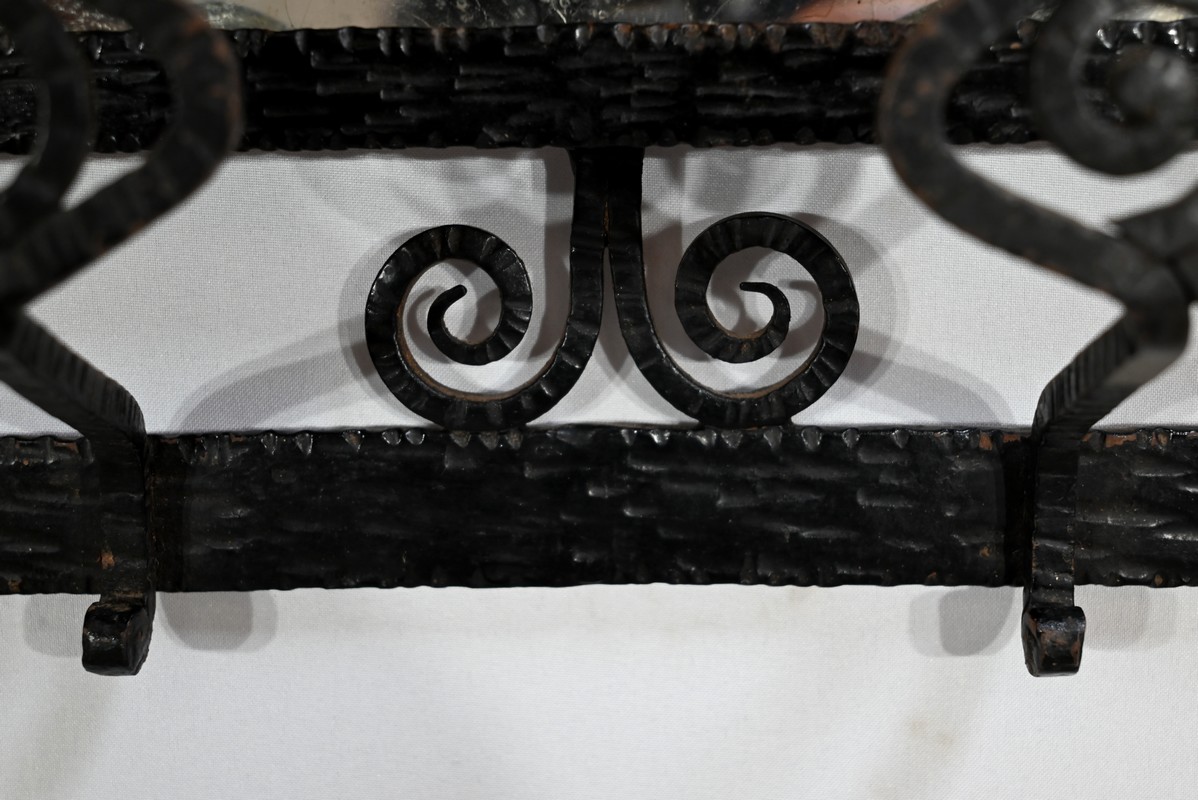 Ce vestiaire présente un cadre en fer forgé ouvragé et agrémenté de diverses volutes.