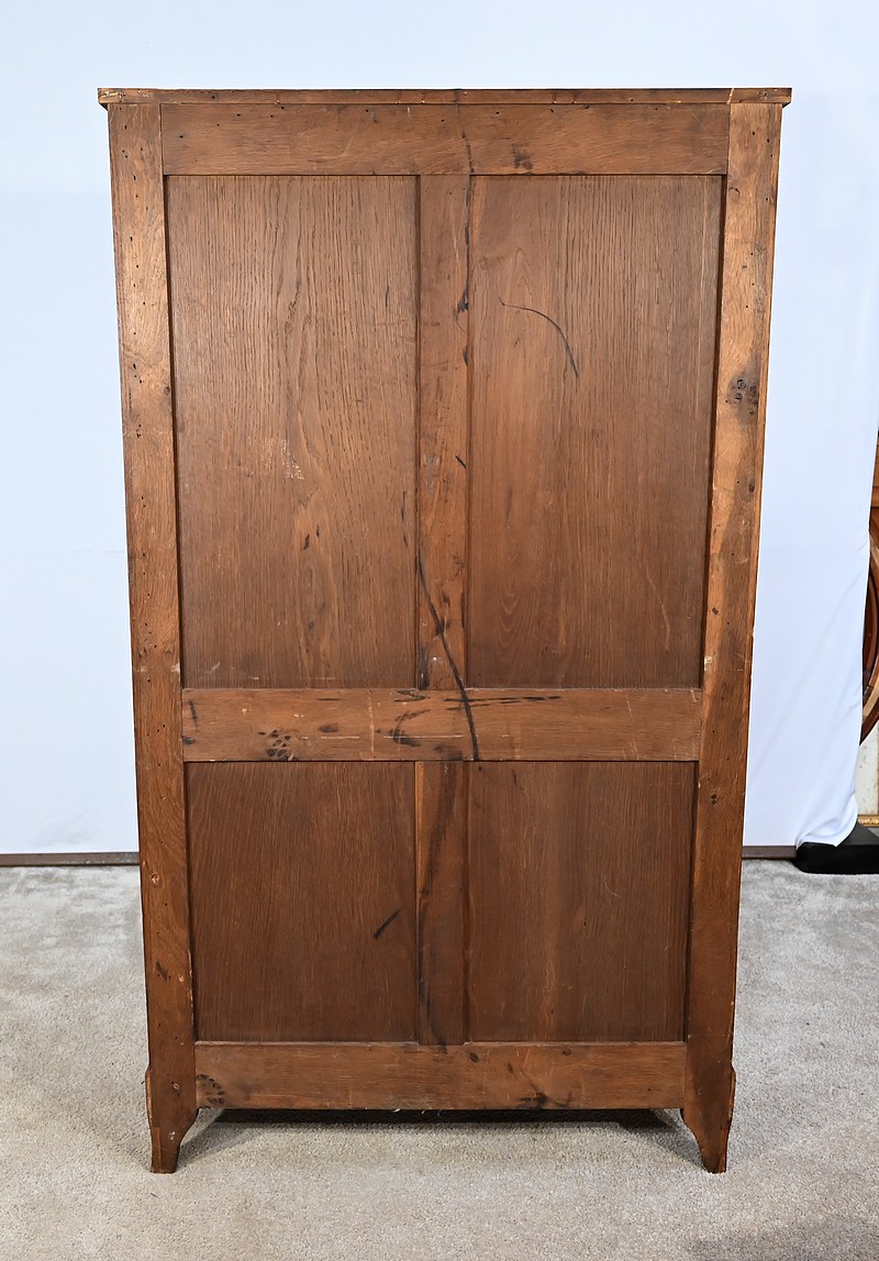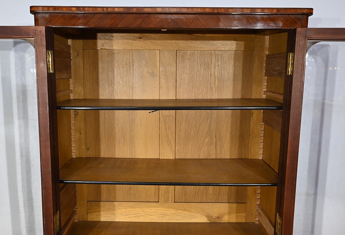 Ce meuble raffiné est composé de deux portes vitrées. La partie basse de celles-ci est pleine et agrémentée d’un placage de quatre feuilles de bois de rose disposées en aile de papillon. Cette composition mouvementée est entourée d’un filet en citronnier entouré d’acajou.