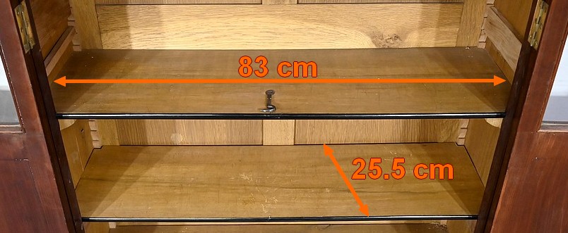 Les deux tiers de ces portes sont vitrés. Nous découvrons un entourage de bois de rose disposé en diagonale accompagné de citronnier et d’acajou. Le haut des portes est légèrement arrondi. Celles-ci sont foncées d’un verre d’origine et possèdent trois charnières laiton. Ce meuble est muni d’une serrure en état de fonctionnement avec sa clé bronze postérieure. Les entrées bronze sont d’origine. La jonction entre les portes est dotée d’un couvre joint en applique de même ton que le dessous. A l’ouverture nous découvrons quatre étagères d’origine en placage de sycomore réglables sur crémaillère et possédant des chants légèrement noircis.