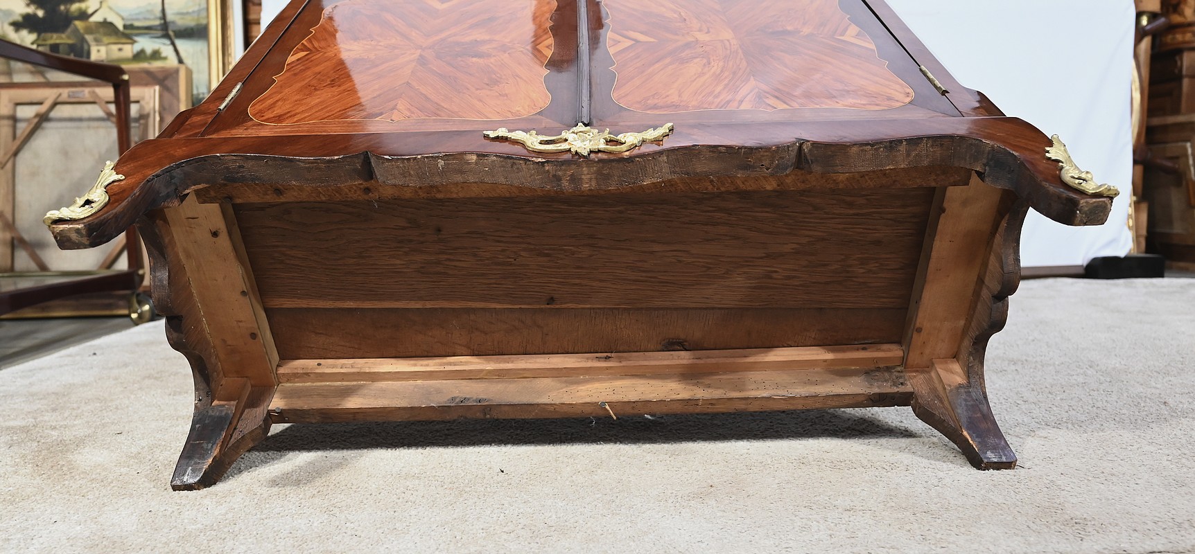 Les côtés de ce meuble sont composés en partie haute d’un panneau en quatre feuilles de bois de rose disposé en ailes de papillons et d’une partie basse qui dispose à l’identique d’une marqueterie entourée d’un filet de citronnier et d’acajou.
