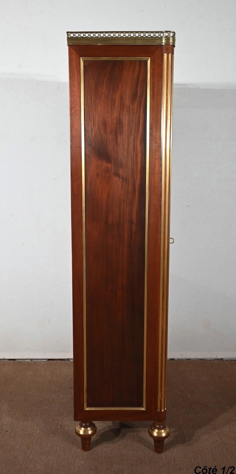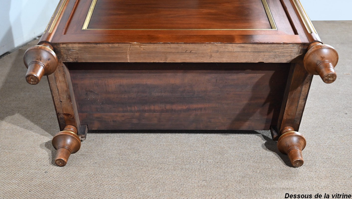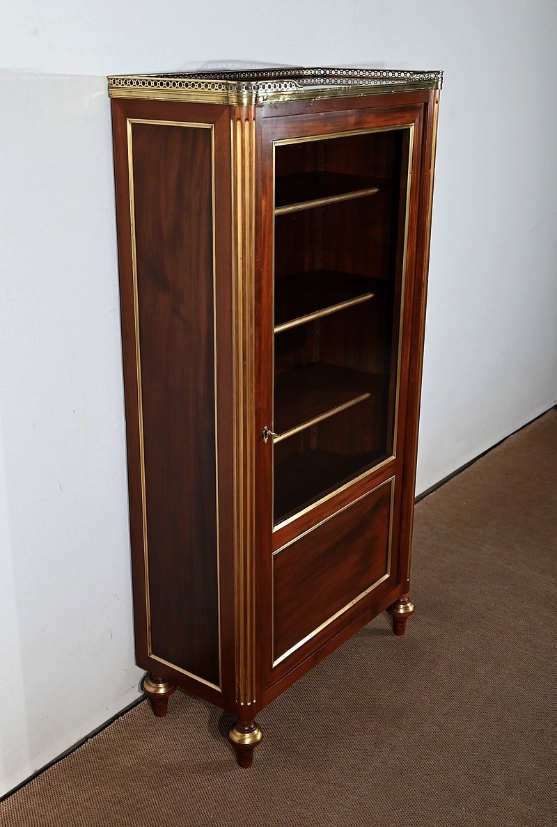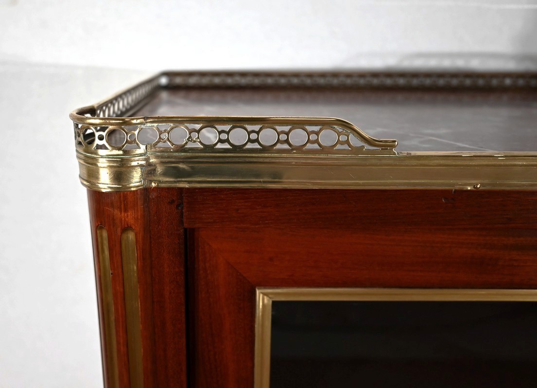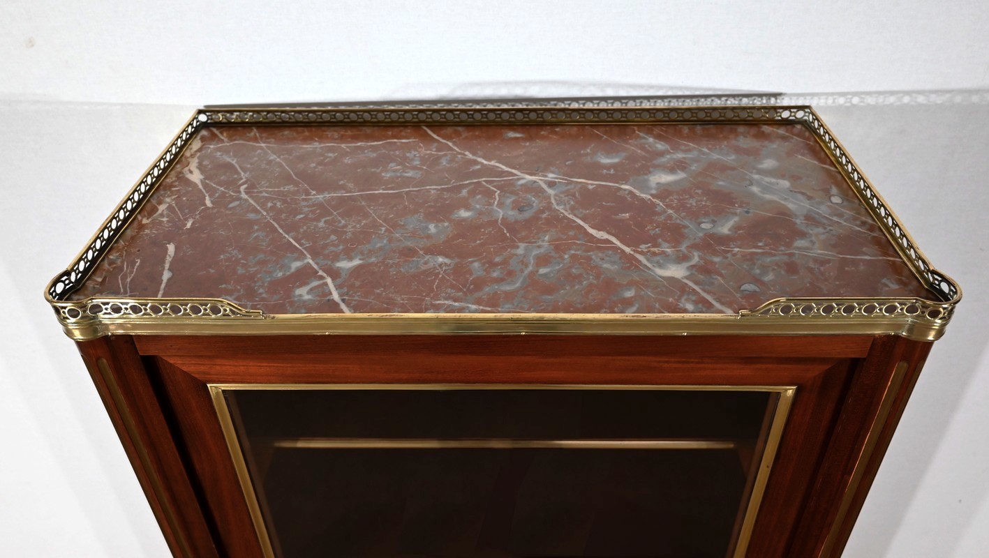 Vitrine à hauteur d’appui, en acajou massif, sommée d’un marbre rouge « Brèche des Pyrénées » à galerie laiton ajouré avec débordements.