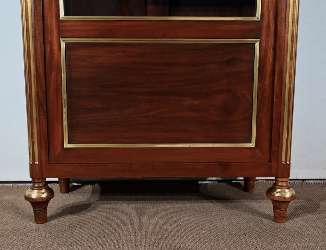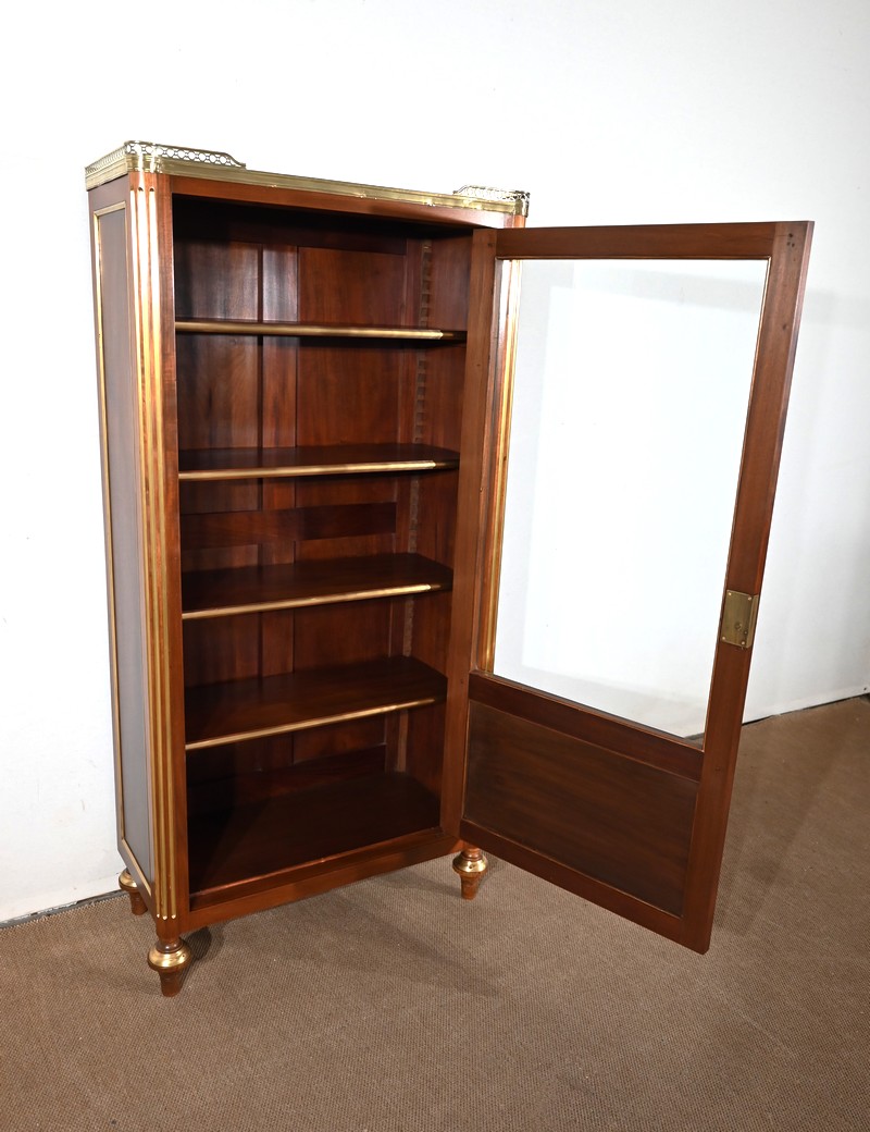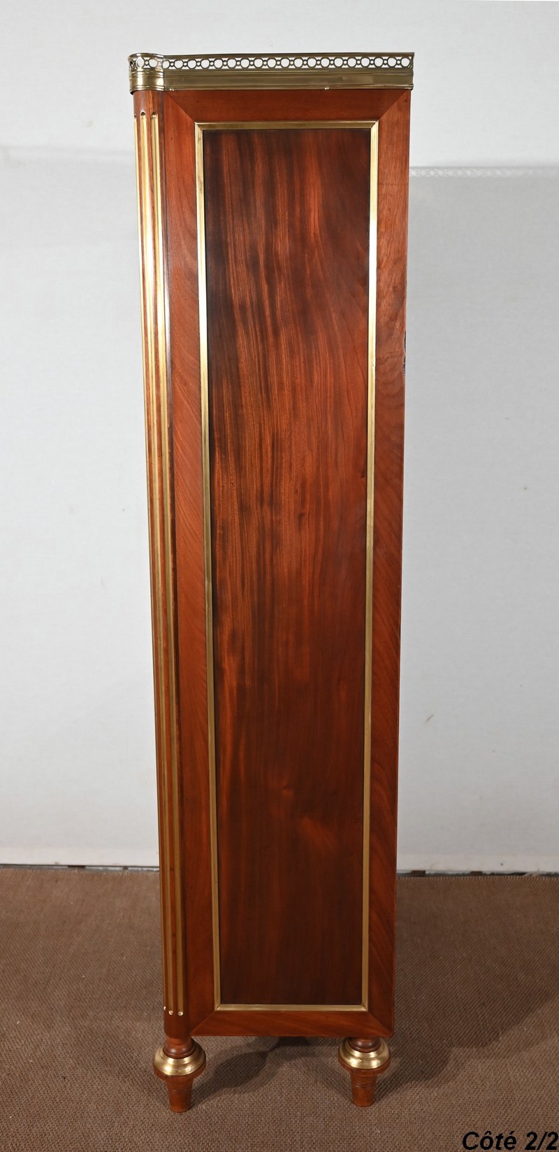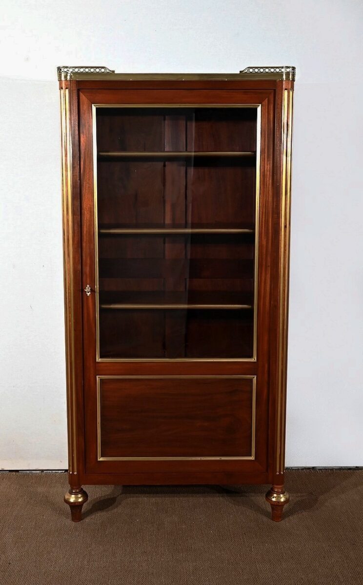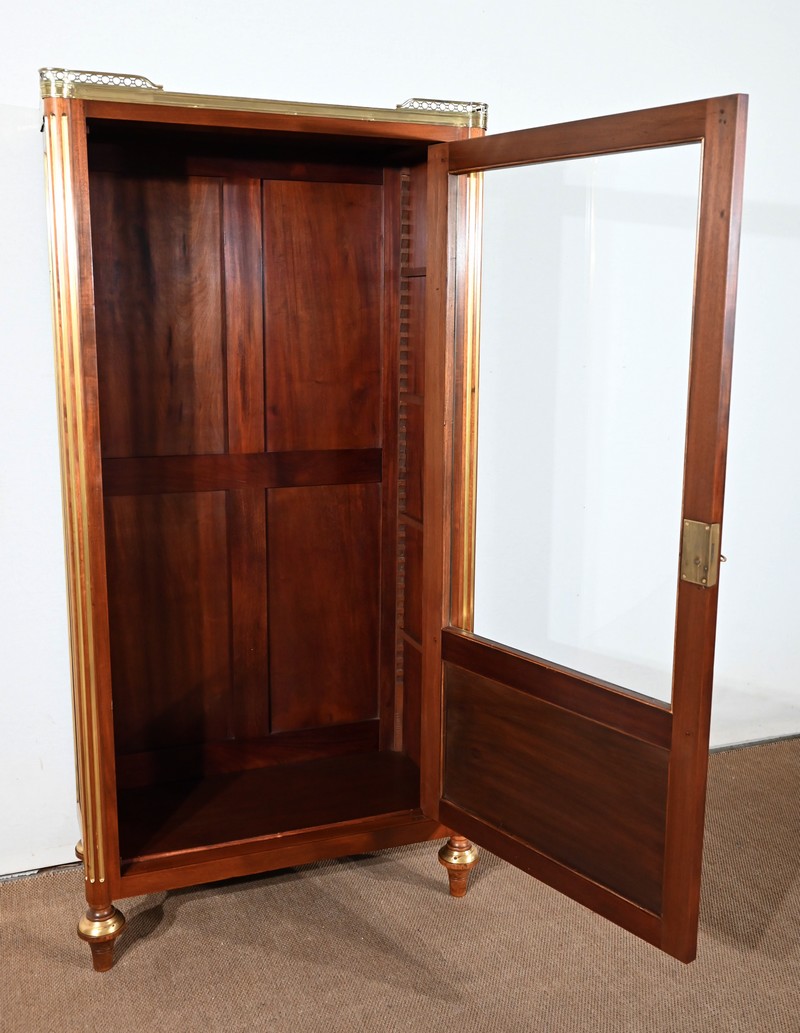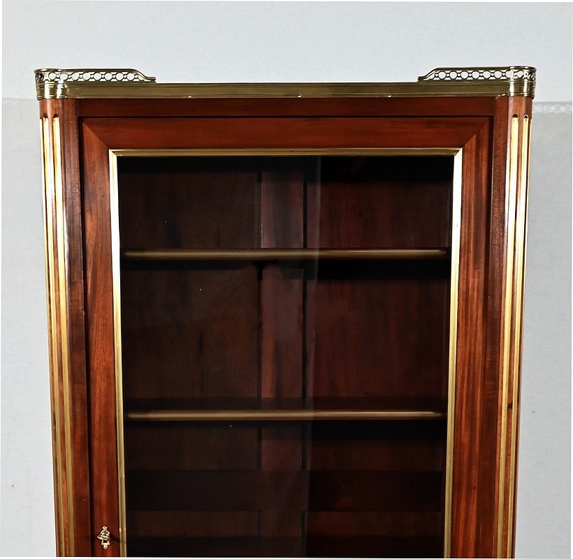 Vitrine à hauteur d’appui, en acajou massif, sommée d’un marbre rouge « Brèche des Pyrénées » à galerie laiton ajouré avec débordements.