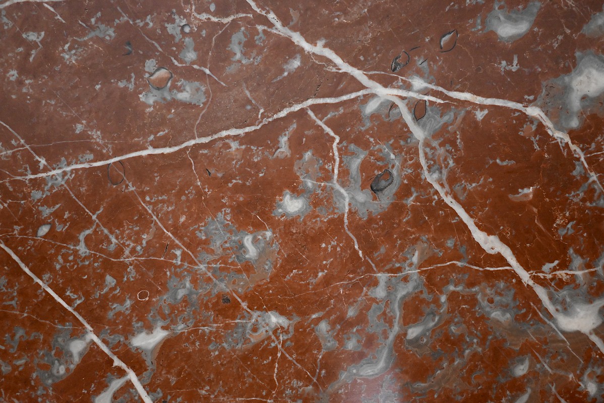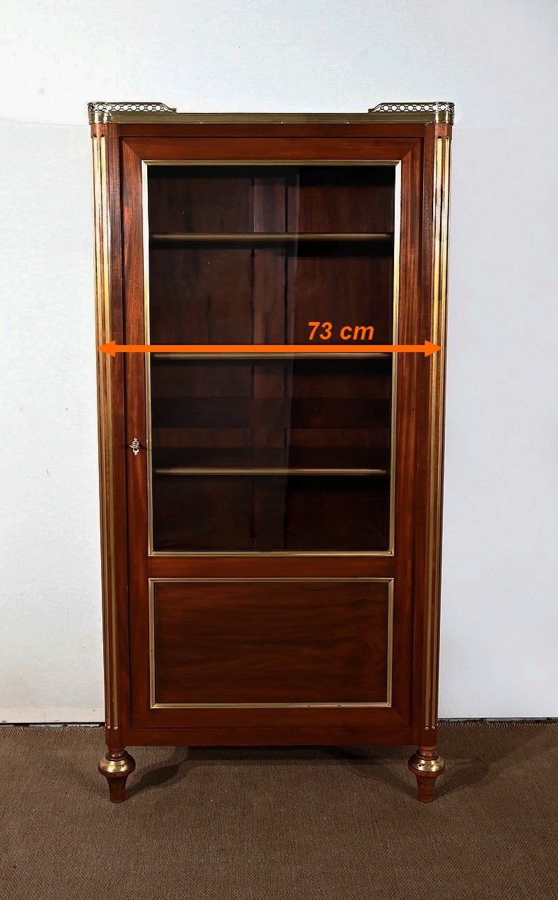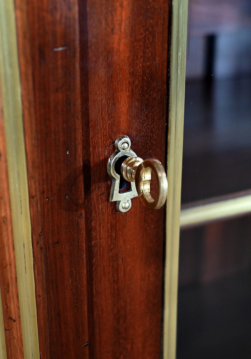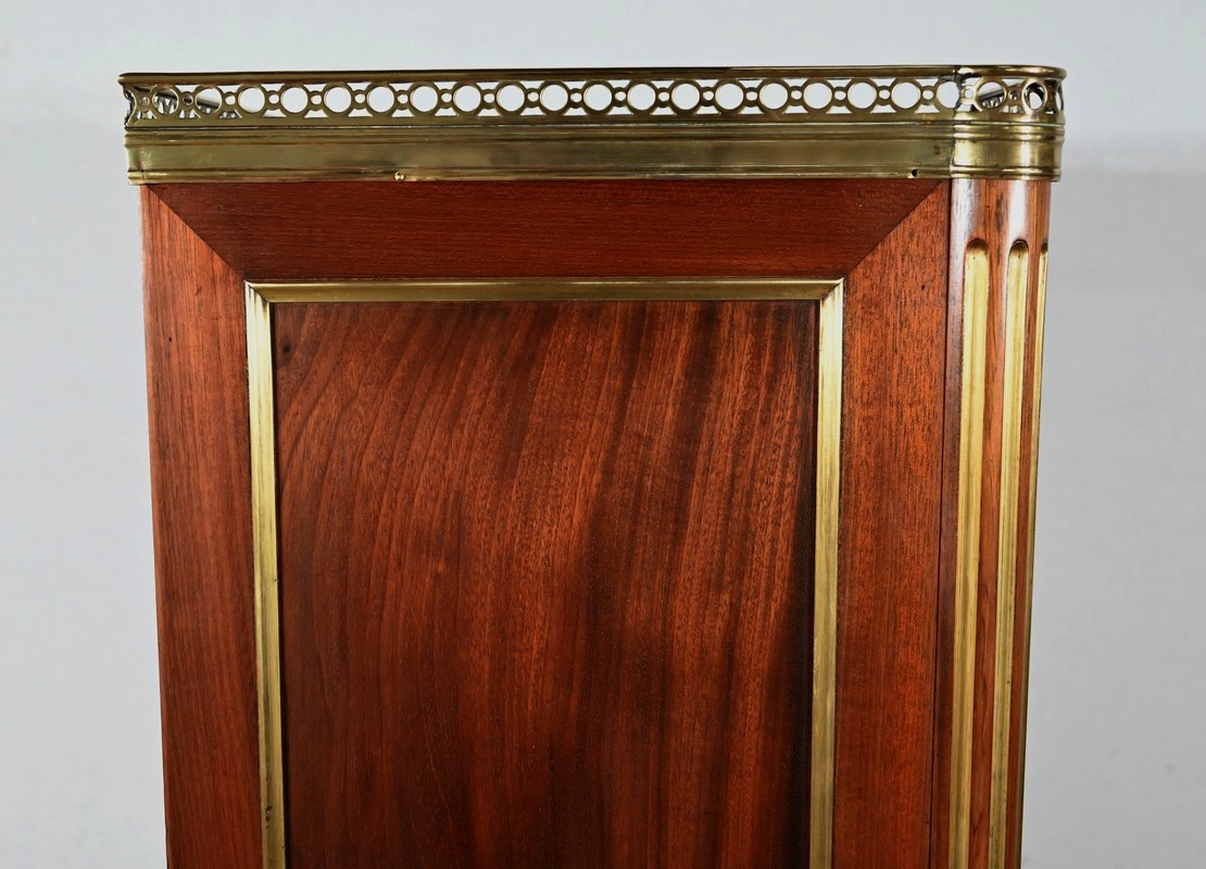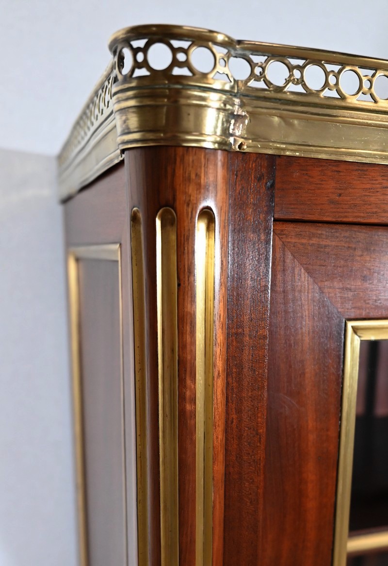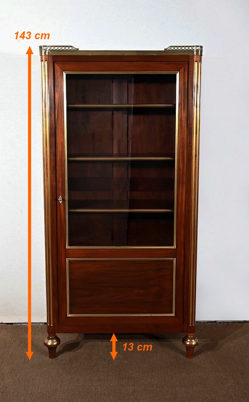 Vitrine à hauteur d’appui, en acajou massif, sommée d’un marbre rouge « Brèche des Pyrénées » à galerie laiton ajouré avec débordements.