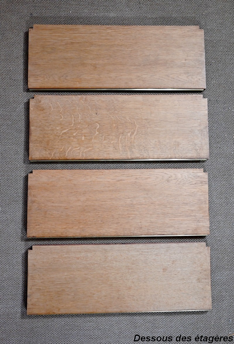 L’intérieur, entièrement en acajou, offre quatre étagères, réglables puisque sur crémaillères, et habillées d’un demi-rond en laiton sur leurs chants.