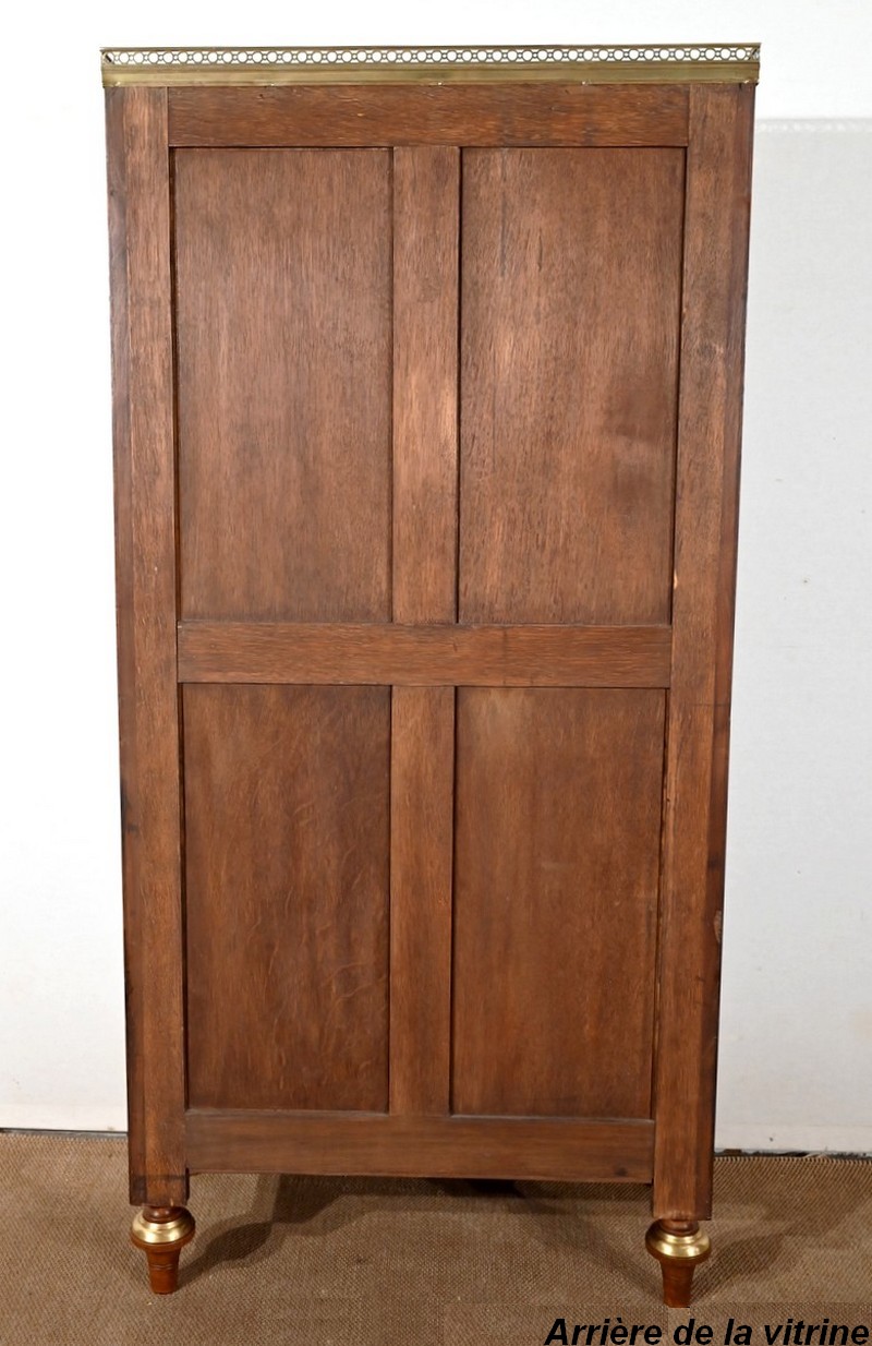 Les côtés de cette vitrine sont composés chacun d’un seul panneau avec baguettes laiton et d’un cadre à coupe d’onglet.