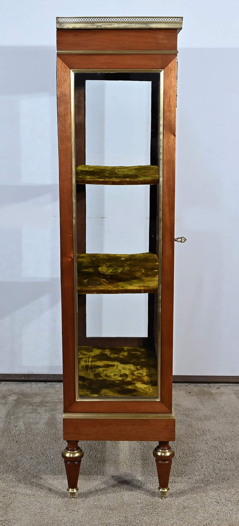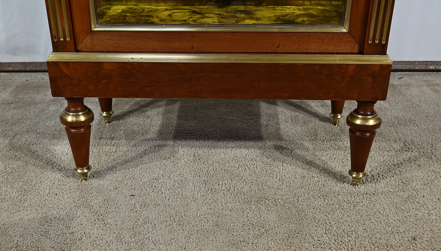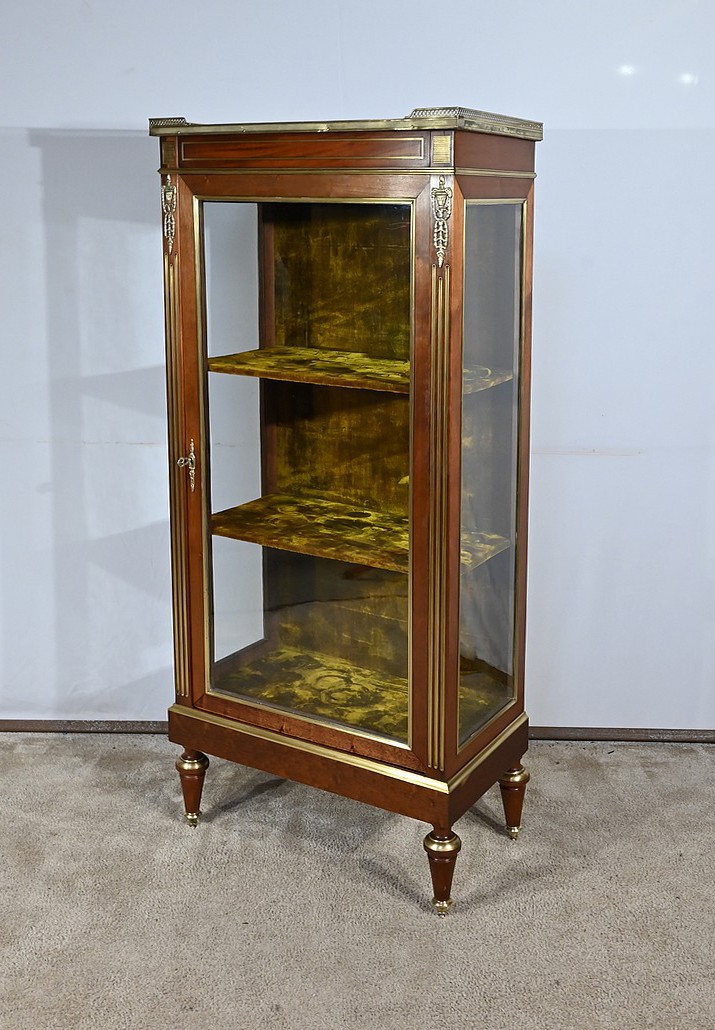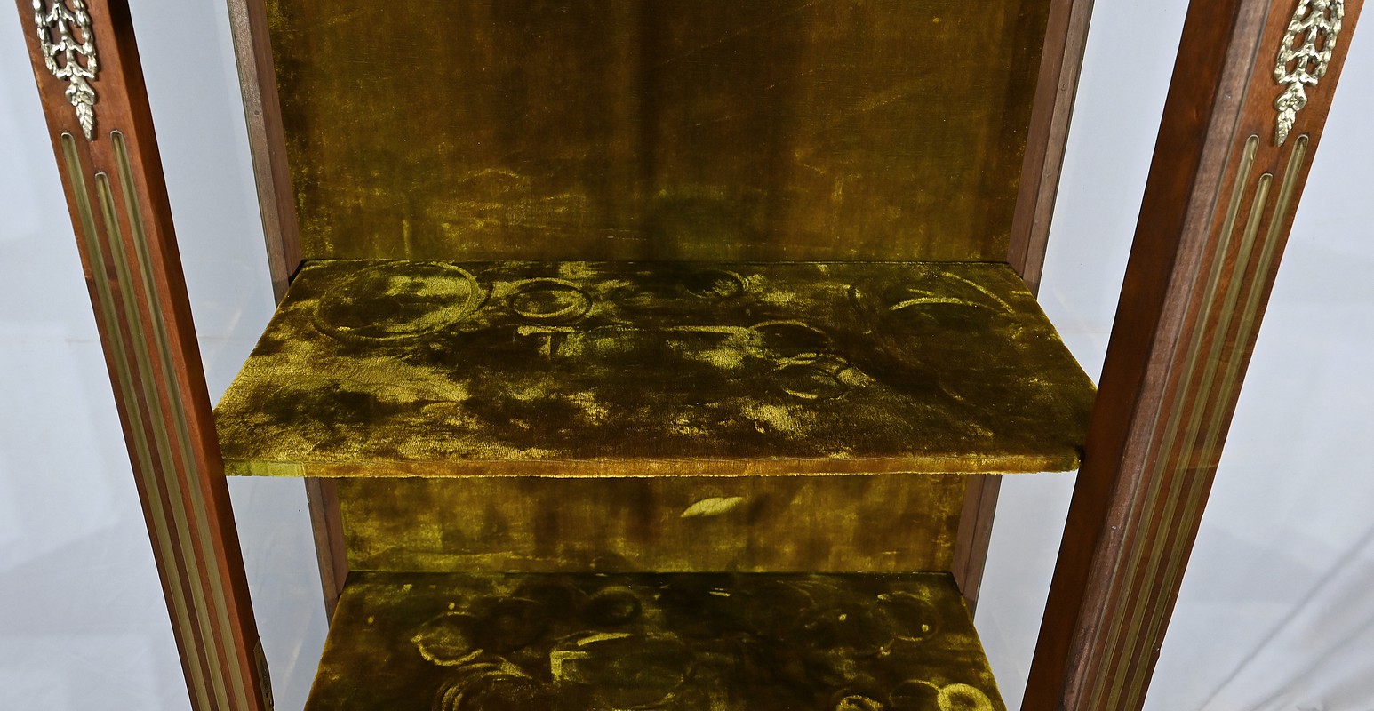 Petite vitrine toutes faces en acajou habillée de moulures en laiton. En effet, ses côtés et l’encadrement de la porte sont décorés de moulures à doucine en laiton. Les montants avec cannelures arrêtées sont également ornés de laiton. En partie haute, ils sont habillés de chutes figurant des flambeaux accompagnés de guirlandes de feuilles. En partie basse, ce meuble possède une plinthe agrémentée d’une large moulure laiton avec gorge et repose sur quatre pieds toupies équipés de sabots. En partie haute, la vitrine possède des plaques striées en façade. Au sommet, nous retrouvons un marbre Brèche Basque, entouré d’une galerie ajourée. La porte vitrée possède une entrée ciselée accompagnée de sa clé et d’une serrure d’origine en parfait état de fonctionnement. Cette vitrine est dotée d’un intérieur tapissé de velours vert scintillant garni de deux étagères.