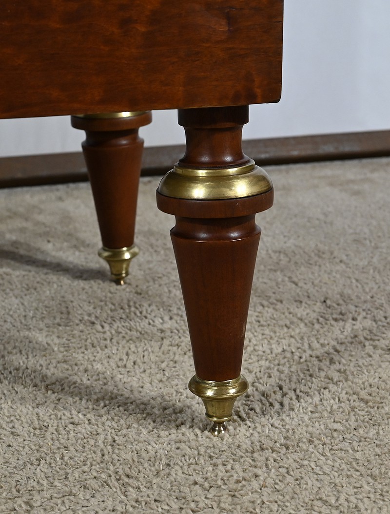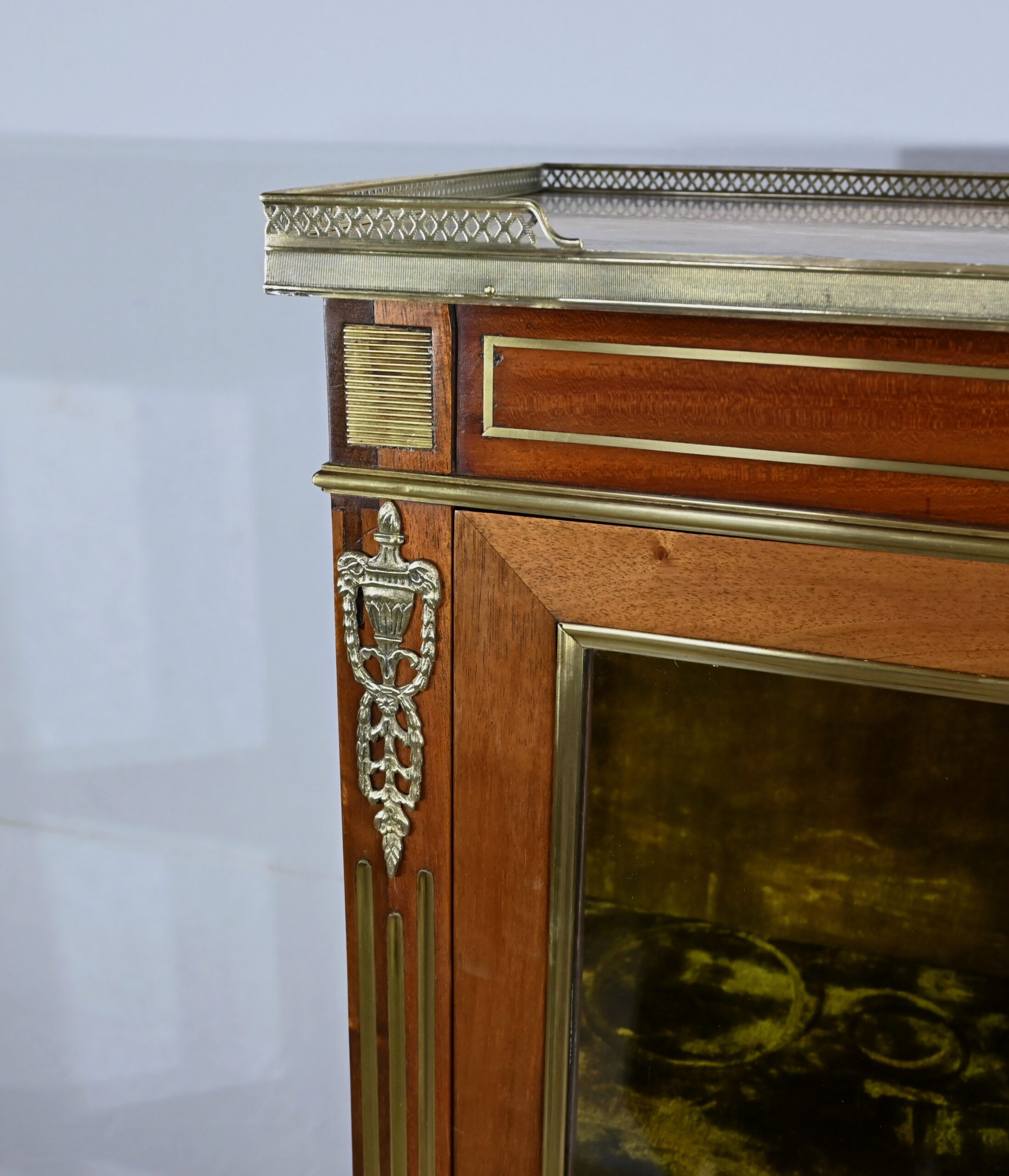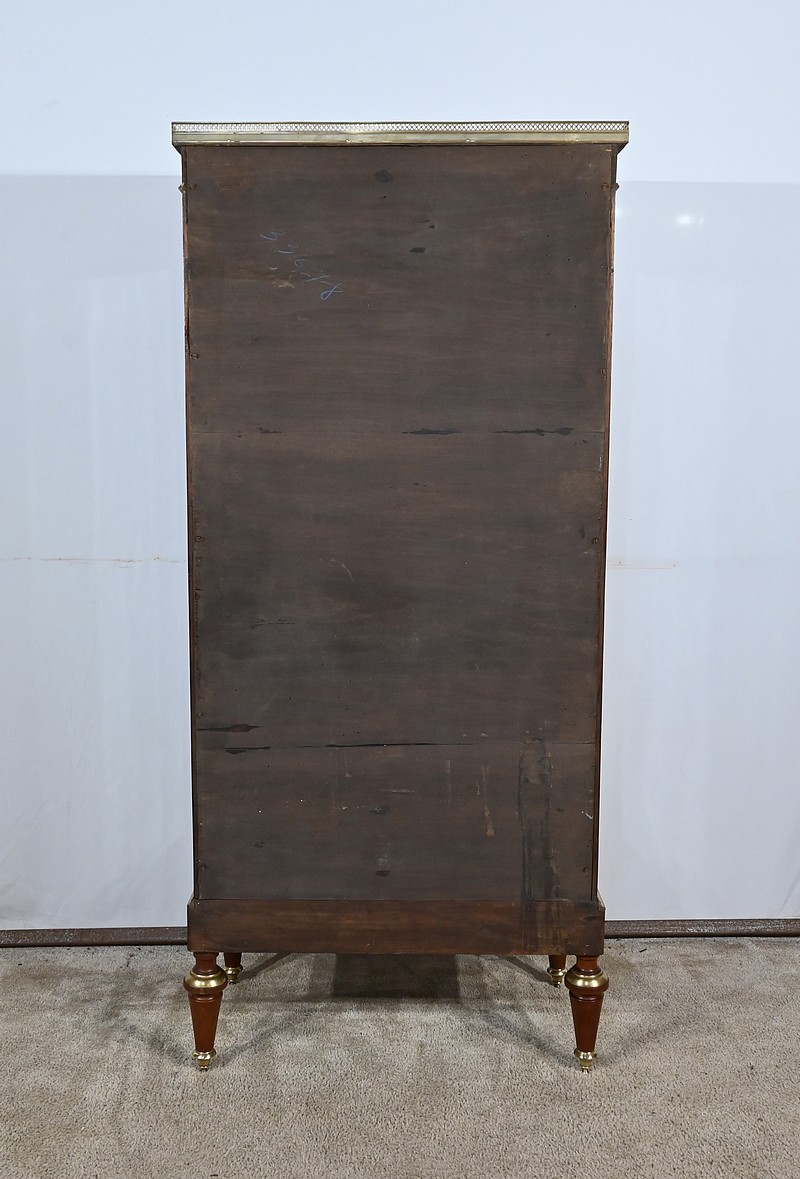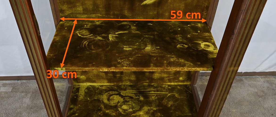 Petite vitrine toutes faces en acajou habillée de moulures en laiton. En effet, ses côtés et l’encadrement de la porte sont décorés de moulures à doucine en laiton. Les montants avec cannelures arrêtées sont également ornés de laiton. En partie haute, ils sont habillés de chutes figurant des flambeaux accompagnés de guirlandes de feuilles. En partie basse, ce meuble possède une plinthe agrémentée d’une large moulure laiton avec gorge et repose sur quatre pieds toupies équipés de sabots. En partie haute, la vitrine possède des plaques striées en façade. Au sommet, nous retrouvons un marbre Brèche Basque, entouré d’une galerie ajourée. La porte vitrée possède une entrée ciselée accompagnée de sa clé et d’une serrure d’origine en parfait état de fonctionnement. Cette vitrine est dotée d’un intérieur tapissé de velours vert scintillant garni de deux étagères.