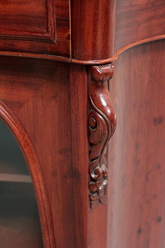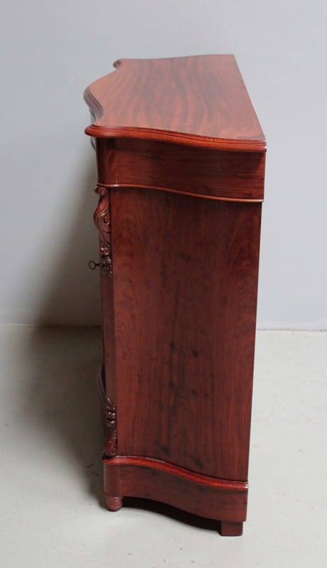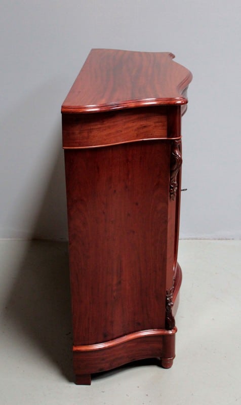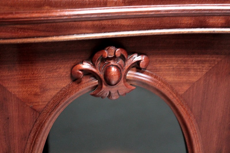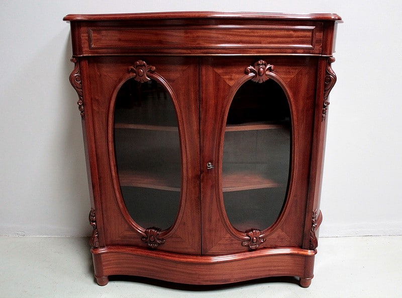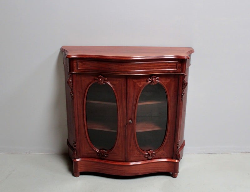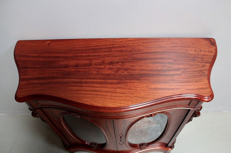 Vitrine basse NAPOLÉON III en placage d’acajou à façade mouvementée et ouvrant par deux portes avec vitres ovales.