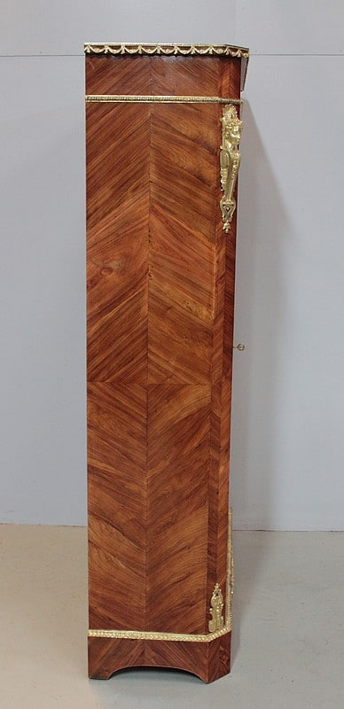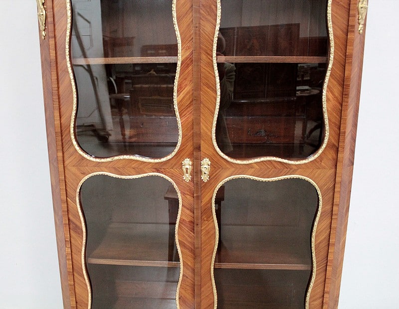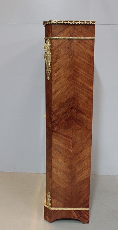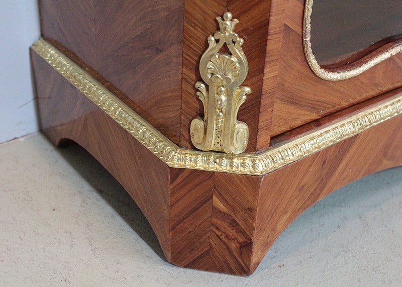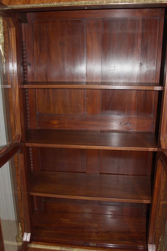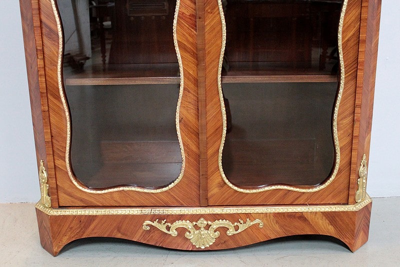Vitrine de style Transition Louis XIV – Louis XV en marqueterie de Bois de Rose. L’intérieur est en placage d’acajou et les 3 étagères en acajou massif.