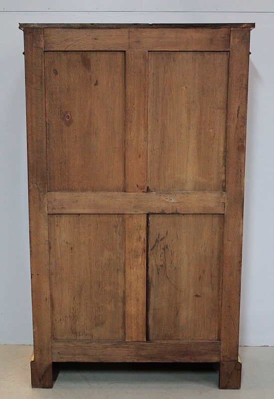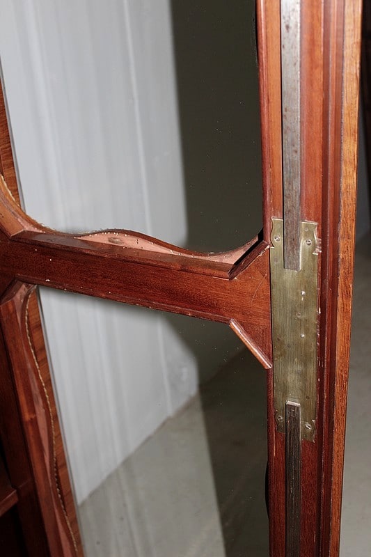 Elle ouvre par 2 portes à médaillons vitrés – vitres d’origine – entourés d’une moulure de bronze ciselé. Serrure deux points.