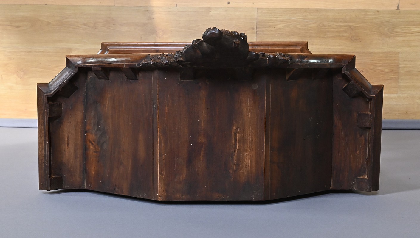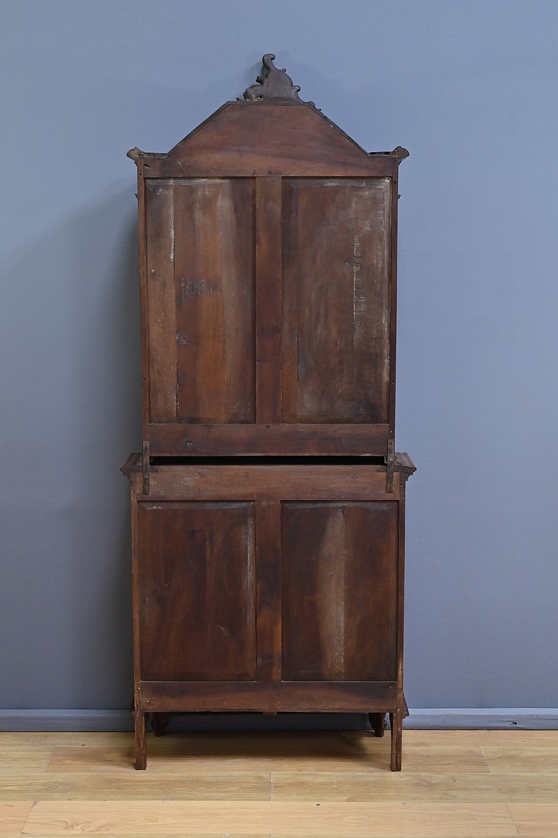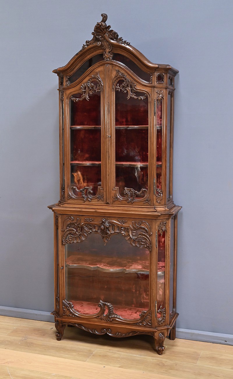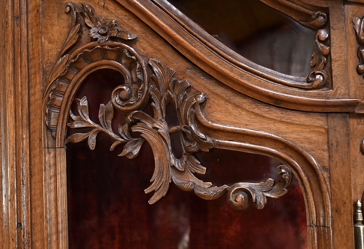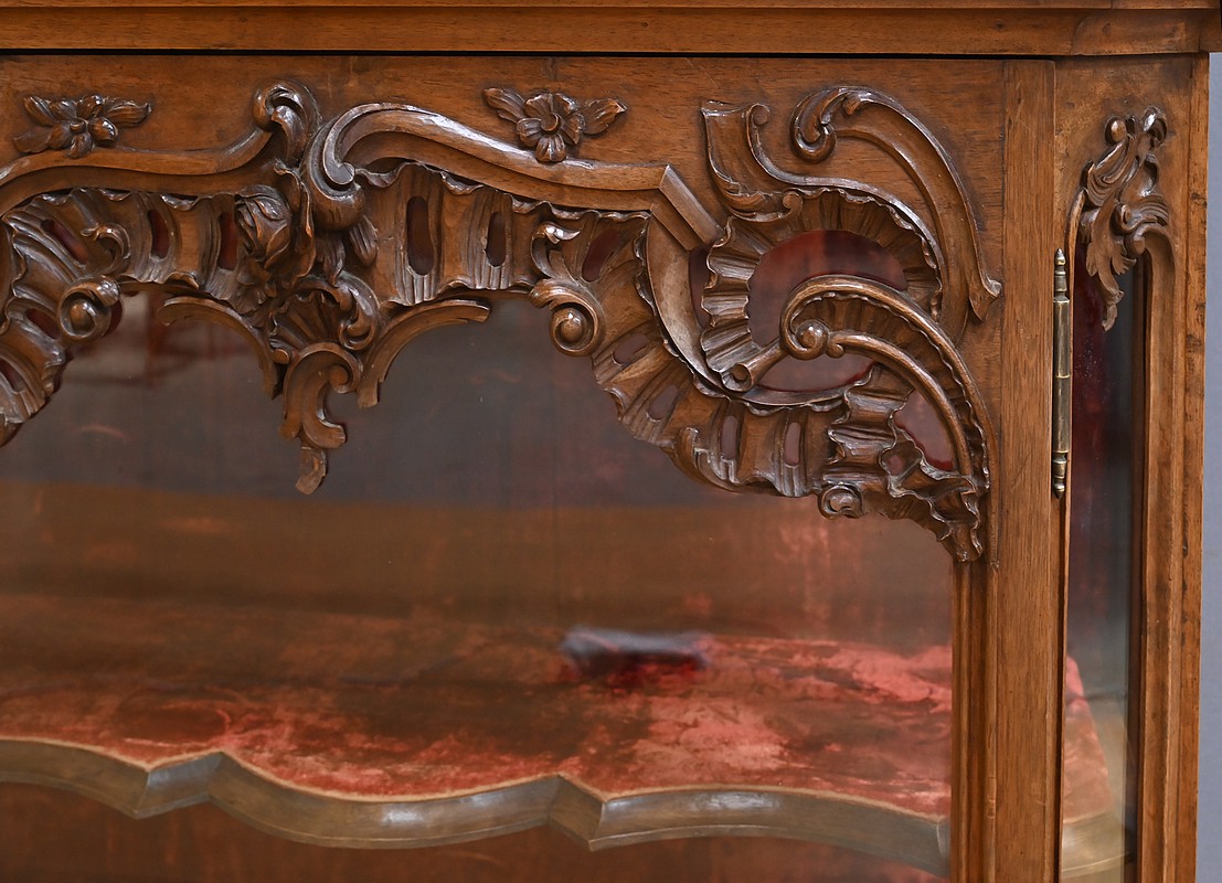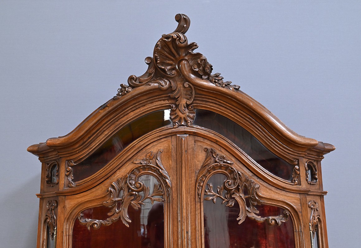 La corniche moulurée, en chapeau de gendarme, est surmontée d’un fronton spectaculaire, orné d’une grande coquille sculptée entourée de volutes élégantes. Ce détail architectural donne à cette vitrine une allure majestueuse. Le meuble est entièrement vitré sur ses faces, ce qui permet une mise en valeur optimale de son contenu. Il s’ouvre par deux portes vitrées en partie haute et une porte en partie basse, toutes équipées de serrures fonctionnelles avec leur clé. Les sculptures abondent sur l’ensemble du meuble, avec des motifs de feuillage et de rinceaux finement travaillés. Les angles à pans coupés, eux aussi vitrés, ajoutent de la légèreté à la structure. Les pieds « escargot » complètent harmonieusement l’ensemble. L’intérieur est entièrement tapissé d’un velours framboise, apportant une touche de chaleur et de raffinement. Les étagères, aux découpes mouvementées, s’inscrivent également dans l’esprit des meubles liégeois. Cette vitrine est idéale pour exposer des objets d’art, de la vaisselle ancienne ou des collections précieuses. Elle allie esthétique, fonctionnalité et histoire, et saura sublimer n’importe quel intérieur.