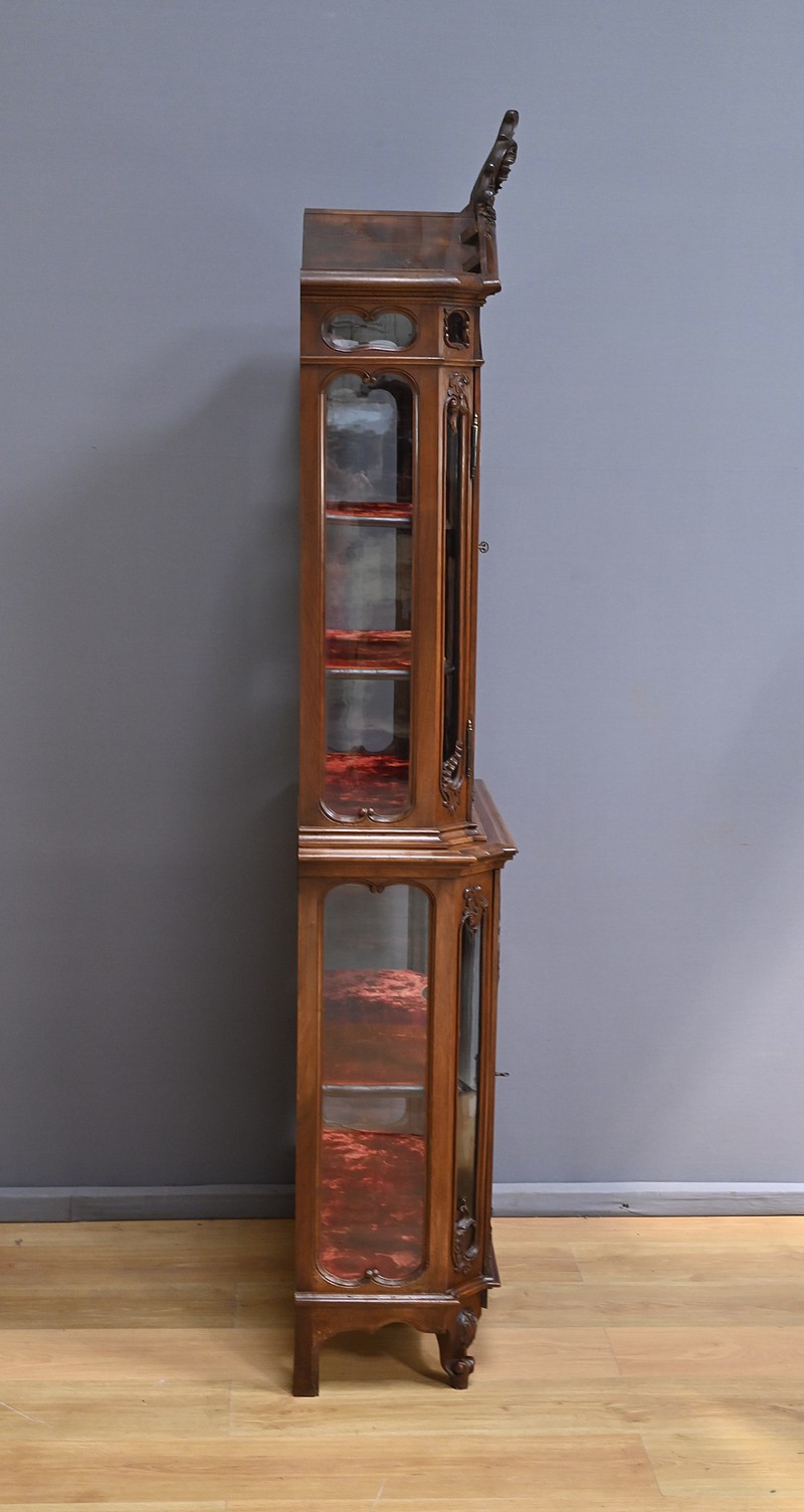 Cette petite vitrine liégeoise deux-corps en noyer, de style Rocaille, est une pièce rare datant de la fin du XIXe siècle. Elle incarne tout le raffinement du mobilier belge de cette époque.
