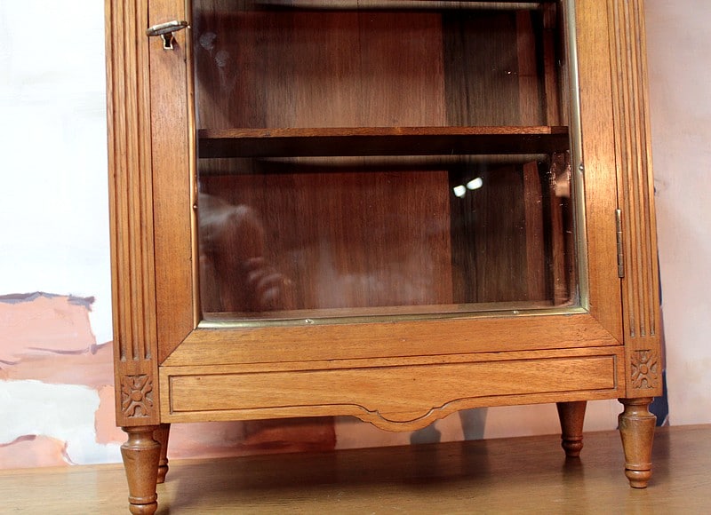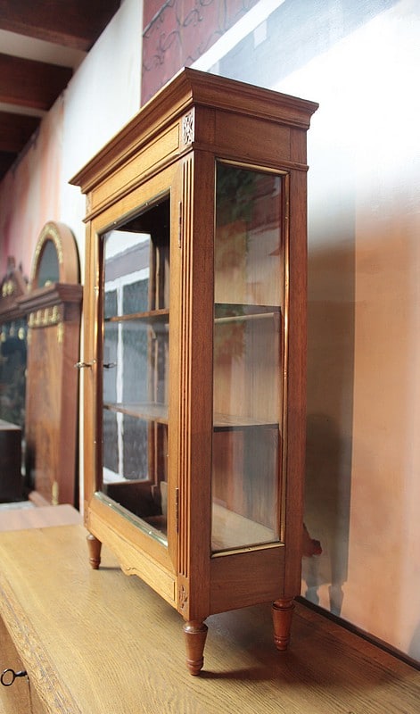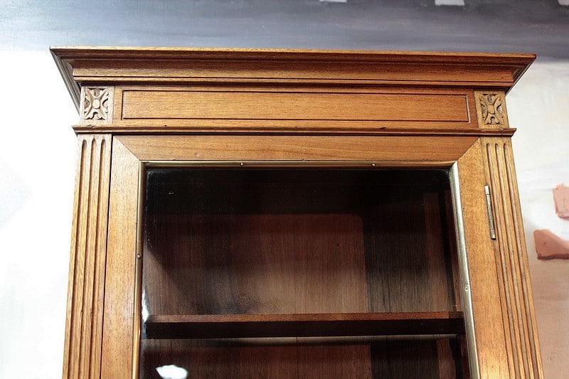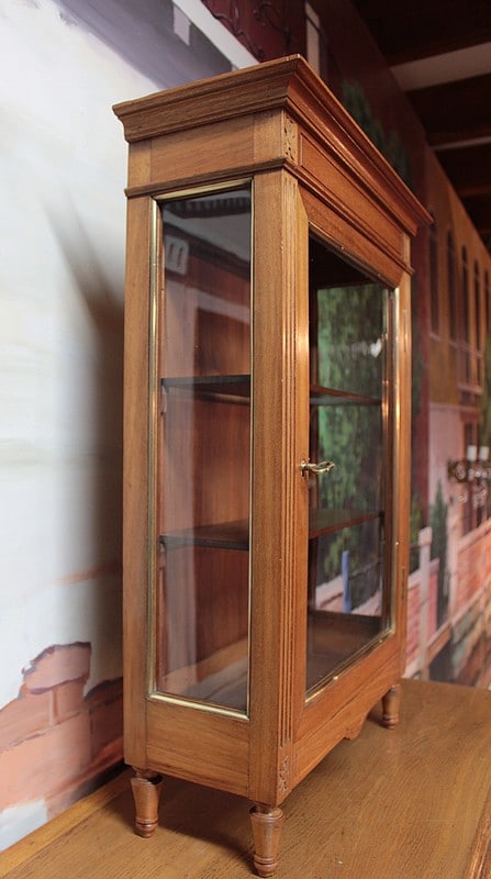 Petite vitrine à suspendre de forme bibliothèque en noyer. Elle est vitrée sur 3 faces et un jonc de laiton entoure chaque vitre. Les montant sont à cannelures et elle repose sur des pieds ‘toupie’ dans le goût Louis XVI.